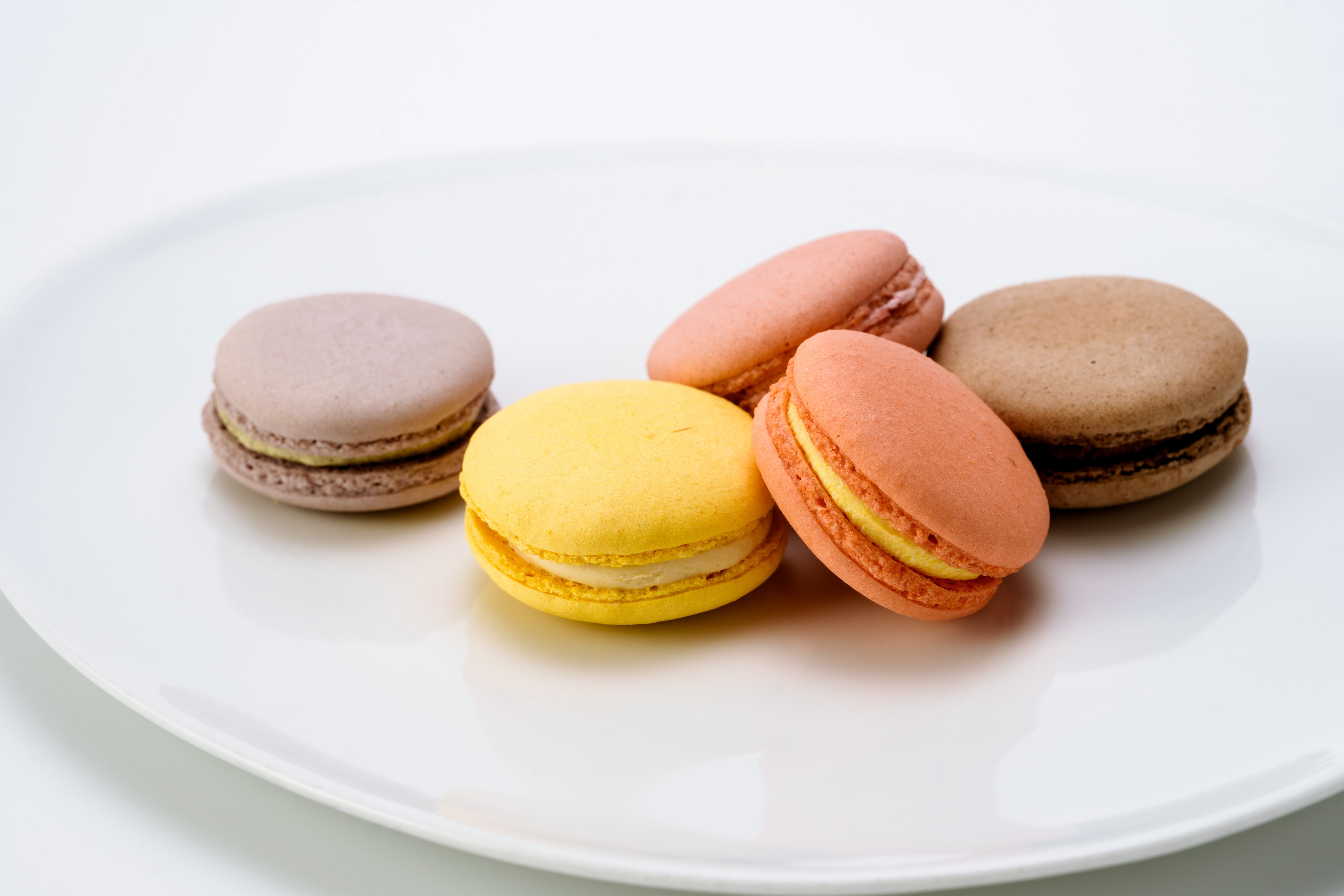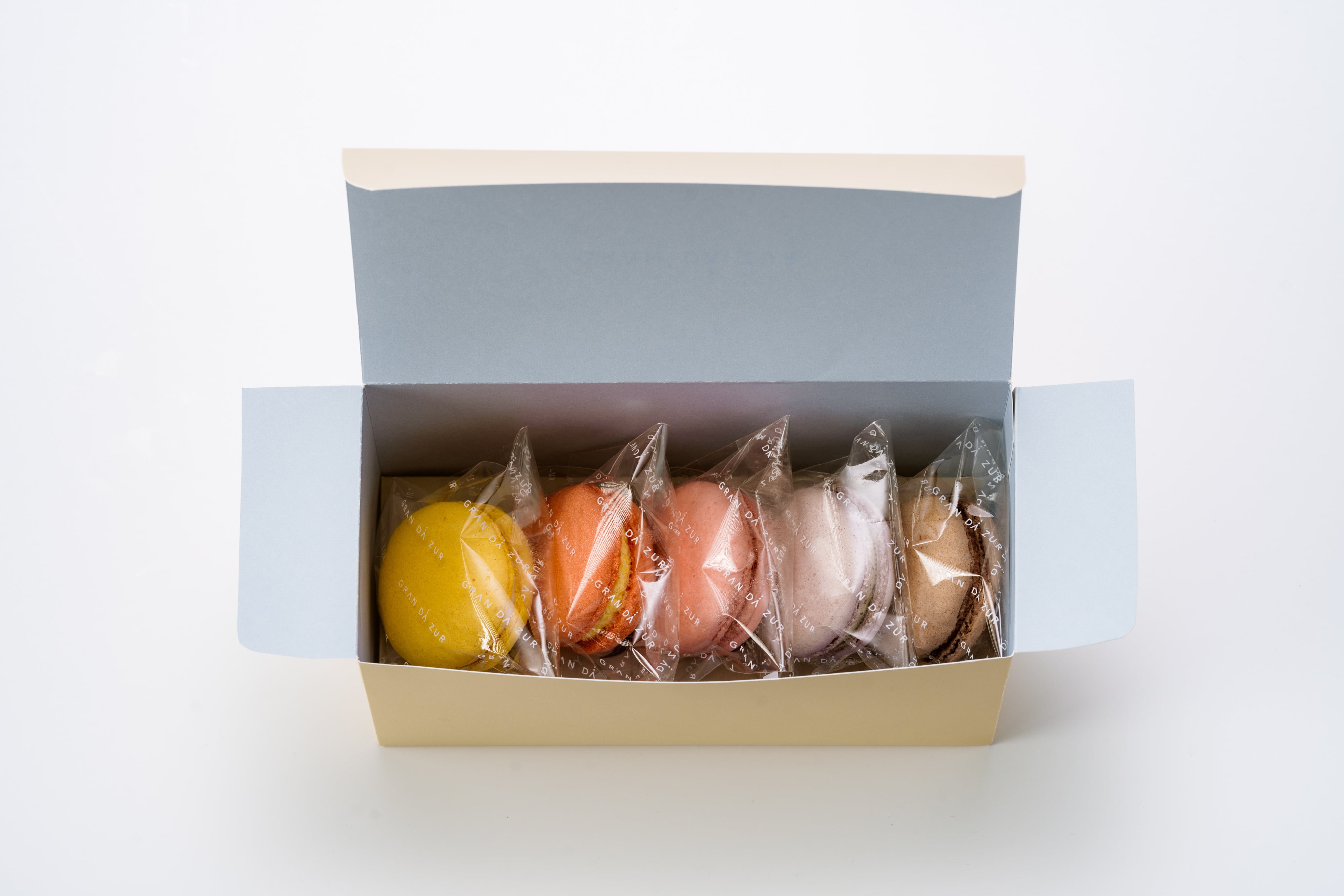 人気の5種類(ショコラ・ほうじ茶・フランボワーズ・マンゴー・塩キャラメル味)のマカロンの詰め合わせ。
